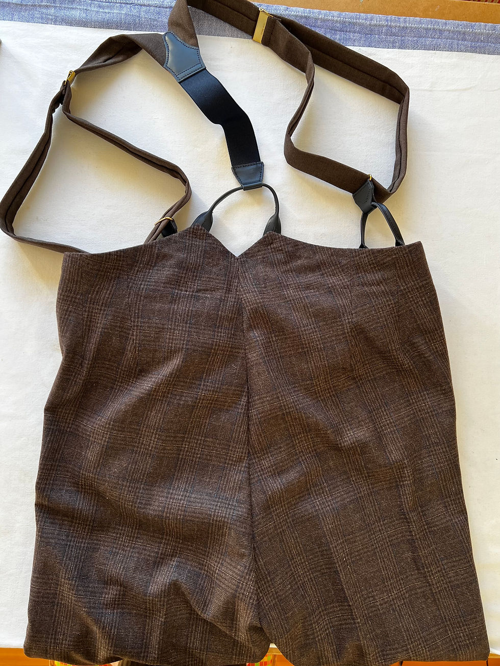 This is my first attempt using a checked fabric for a waistcoat and my first pair of trousers with a brace-top half band.Unfortunately, the pattern at the seat seam didn’t turn out symmetrical.But I’m satisfied, and the garments are wearable.